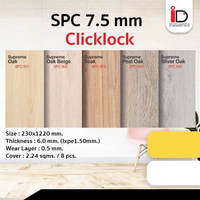 แผ่นพื้น SPC ลายไม้ แบบ CLICK LOCK รุ่น SUPREME SERIES ความหนา 7.5 mm. SIZE : 230 x 1220 mm. THICKNESS : 6.0 mm. (ixpe 1.50 mm.) WEAR LAYER : 0.5 mm. COVER : 2.24 sqms. / 8 pcs. / Box