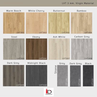 กระเบื้องยาง LVT ลายไม้แบบทากาว รุ่น VIRGIN MATERIAL ความหนา 3 mm. ** ลายไม้ ** SIZE : 152.4 x 914.4 x 3 mm. COVER : 2.508 sqms. / 18 pcs. / Box ** ลายหิน ** SIZE : 304.8 x 609.6 x 3 mm. COVER : 3.716 sqms. / 20 pcs. / Box