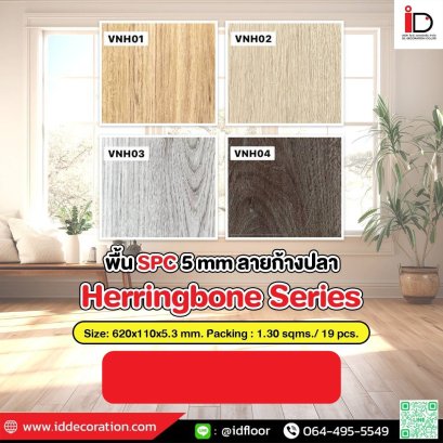 พื้น SPC ลายไม้ แบบ CLICL LOCK รุ่น Herringbone-VNH Series ความหนา 5.3 mm. Herringbone Series SIZE : 620 x 110 x 5.3 mm. PACKING : 1.30 Sqms. / 19 pcs.