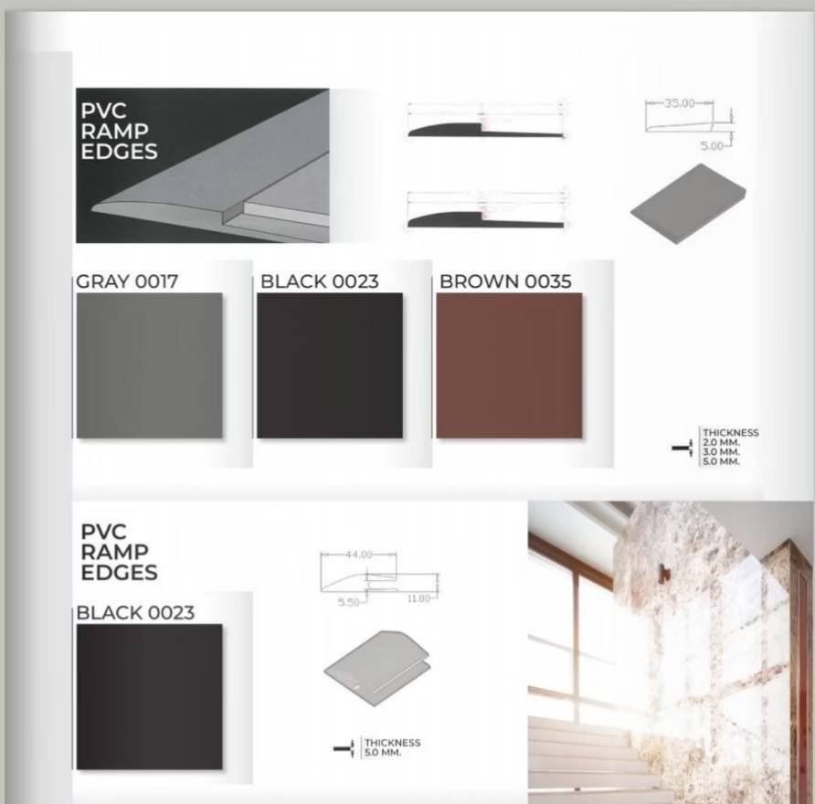 เส้นกั้นขอบ (PVC RAMP EDGING) ประโยชน์ในการใช้งาน - ใช้กั้นขอบของกระเบื้อง PVC บนพื้นระดับเดียวกัน - ใช้เป็นจุดจบของการปูกระเบื้องPVCปูพื้น เช่น บริเวณธรณีประตู - ช่วยรักษาขอบของกระเบื้องPVC ไม่ให้ได้รับความเสียหาย - เพื่อความสวยงามและเวลาเดินไม่สะดุด ขนาด : ความหนา 2 mm. , 3 mm. และ 5 mm. สี : ดำ , น้ำตาล , เทา บรรจุ : 50เมตร./กล่อง