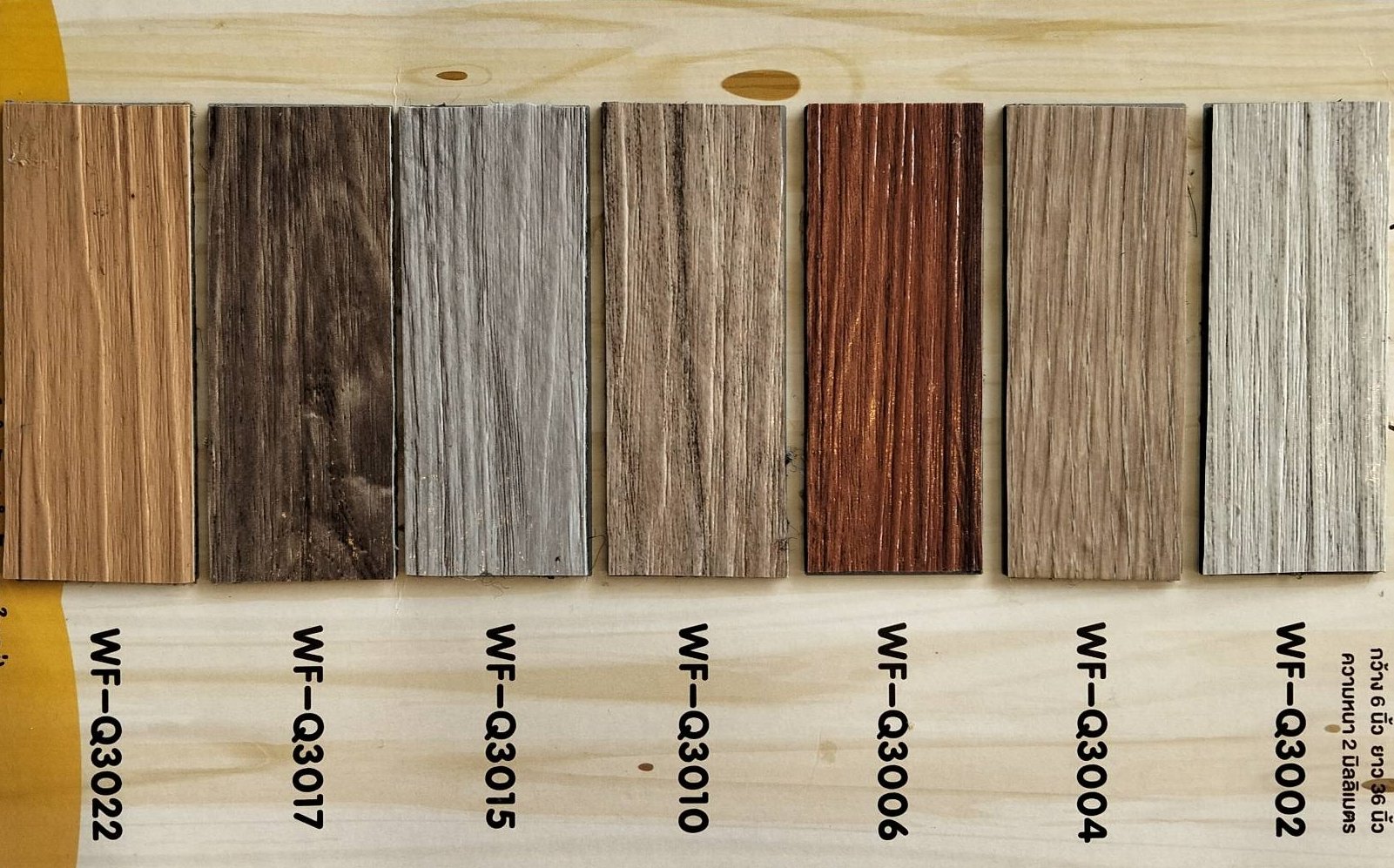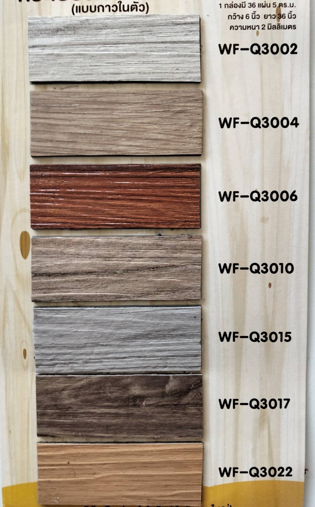 กระเบื้องยางลายไม้แบบกาวในตัว ความหนา 2 mm. รุ่น WF-Q 1 กล่อง มี 36 แผ่น ปูได้ 5 ตร.ม. SIZE : ก 6" x ย 36" ความหนา : 2 mm.