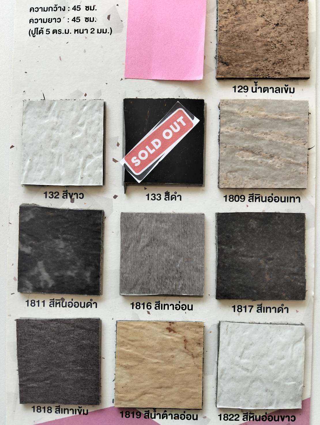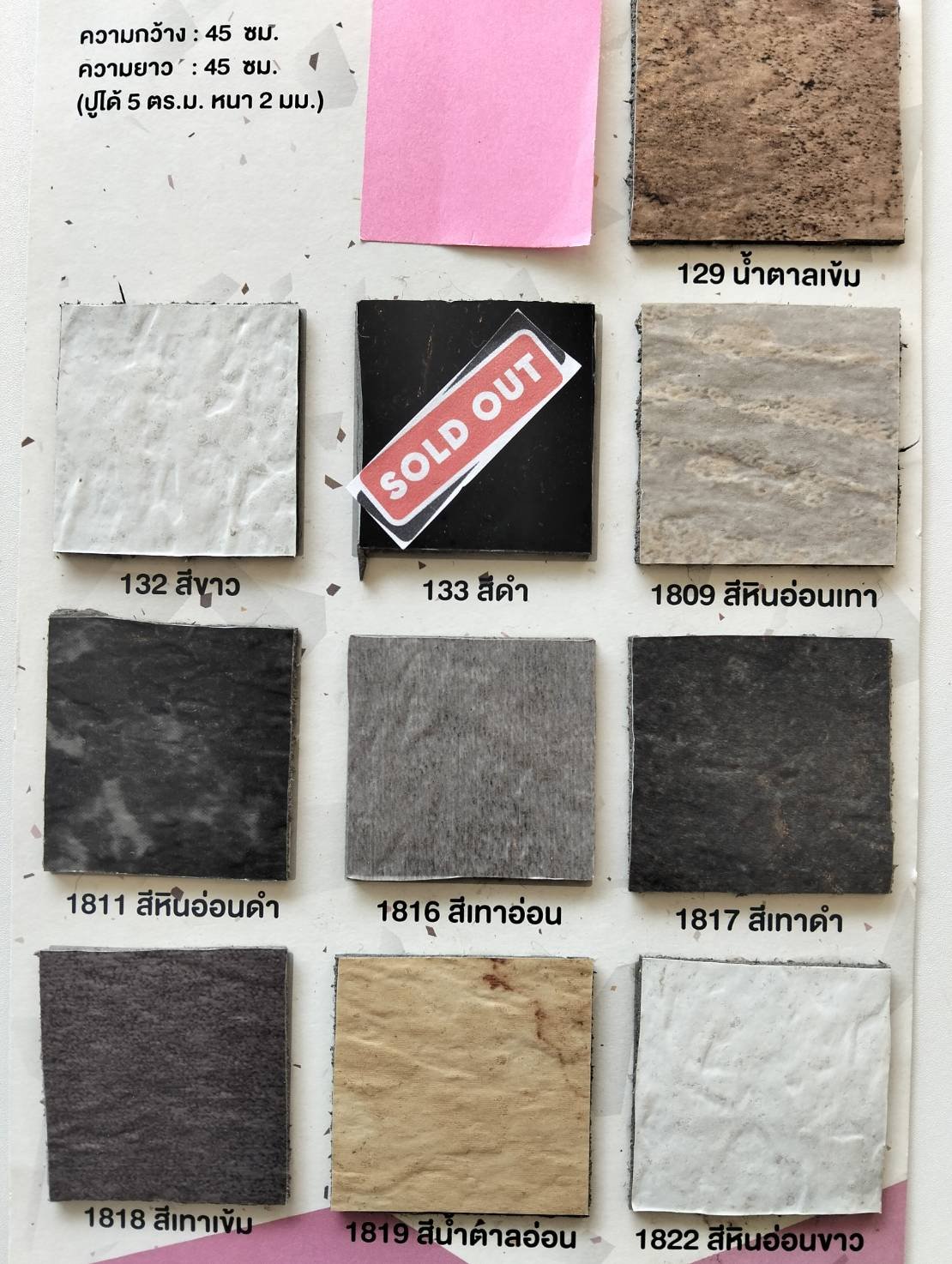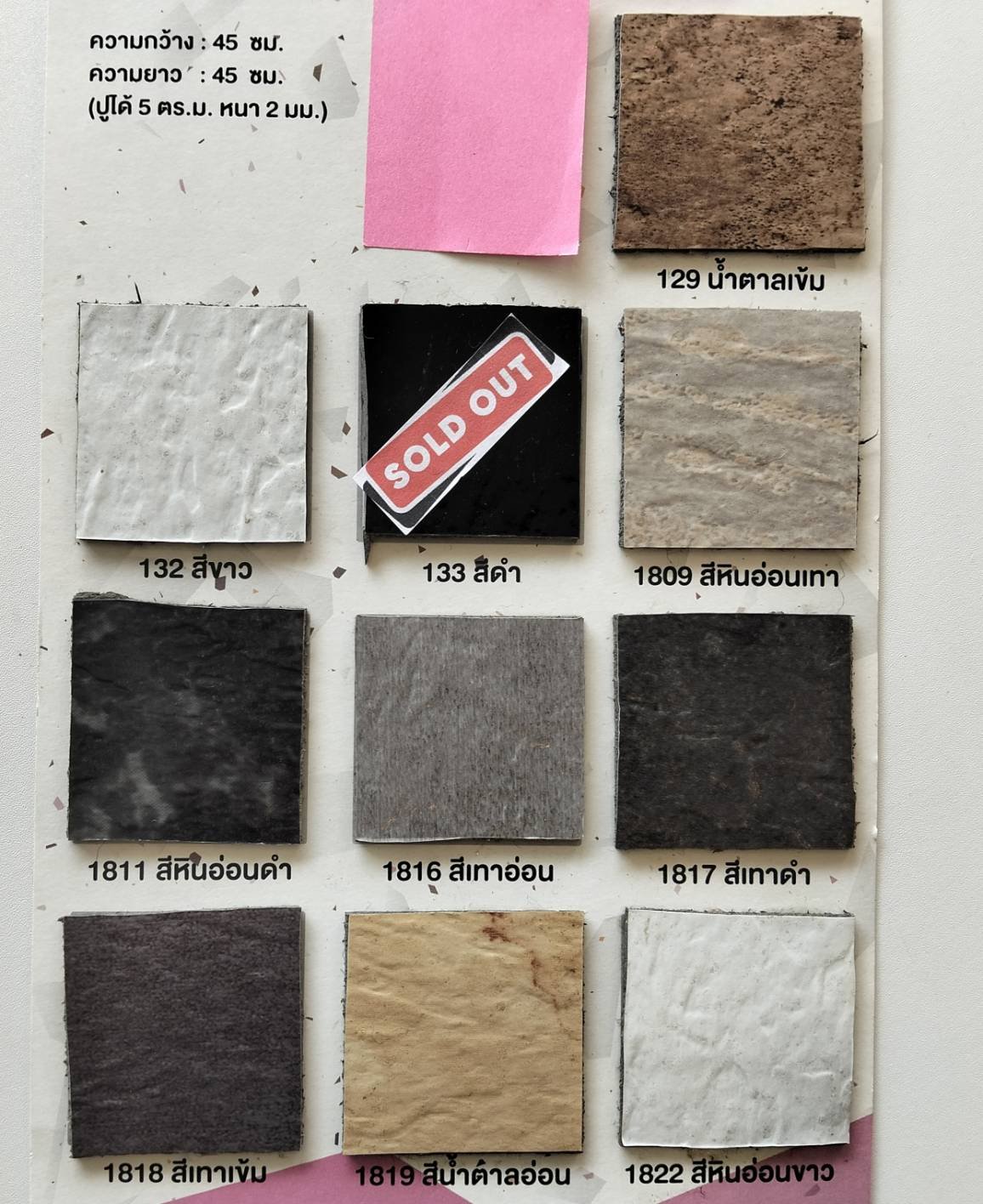 กระเบื้องยางลายหินแบบกาวในตัว ความหนา 2 mm. SIZE : กว้าง 45 x ยาว 45 cm. ความหนา 2 mm. 1 กล่อง ปูได้ 5 ตร.ม.